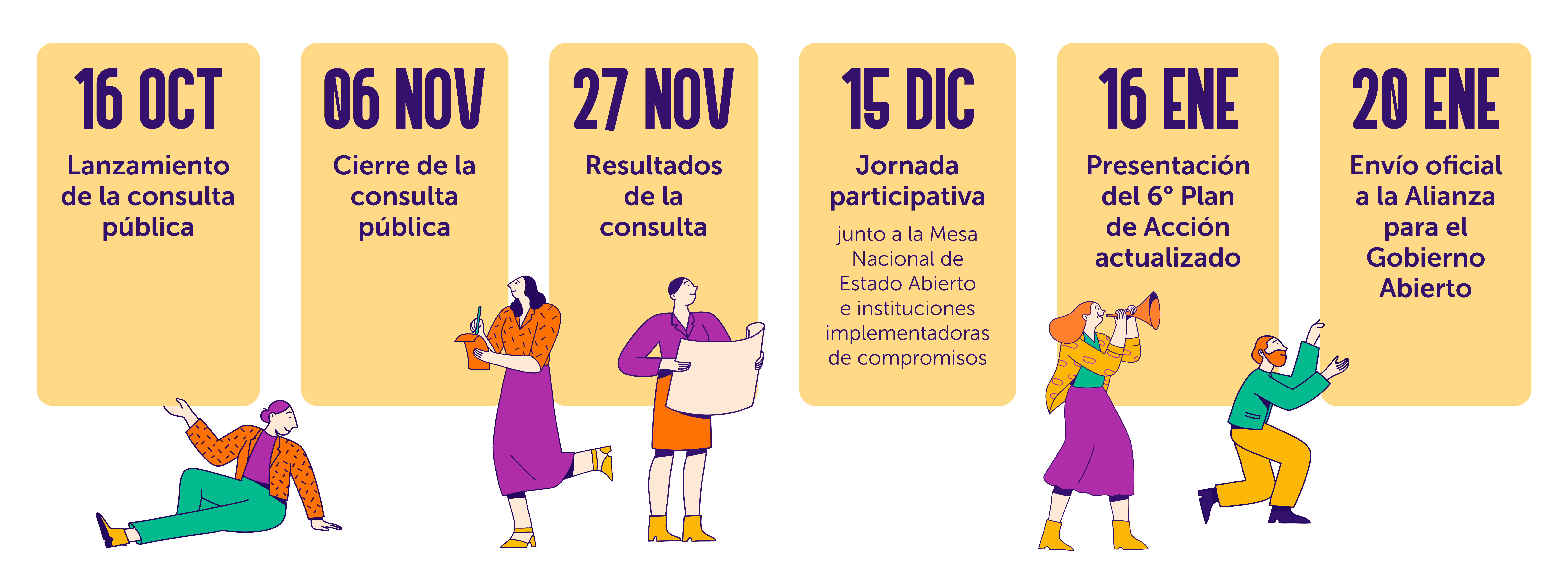 Actualmente, se está realizando un proceso de actualización del 6° Plan de Acción de Estado Abierto (2023-2027), que incluye 11 compromisos en diversas áreas, como transparencia en compras públicas, justicia abierta, cambio climático, entre otros.